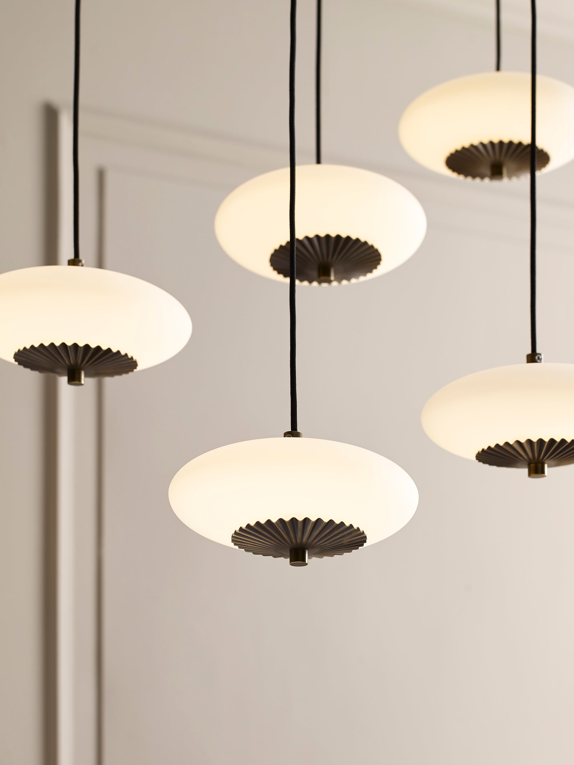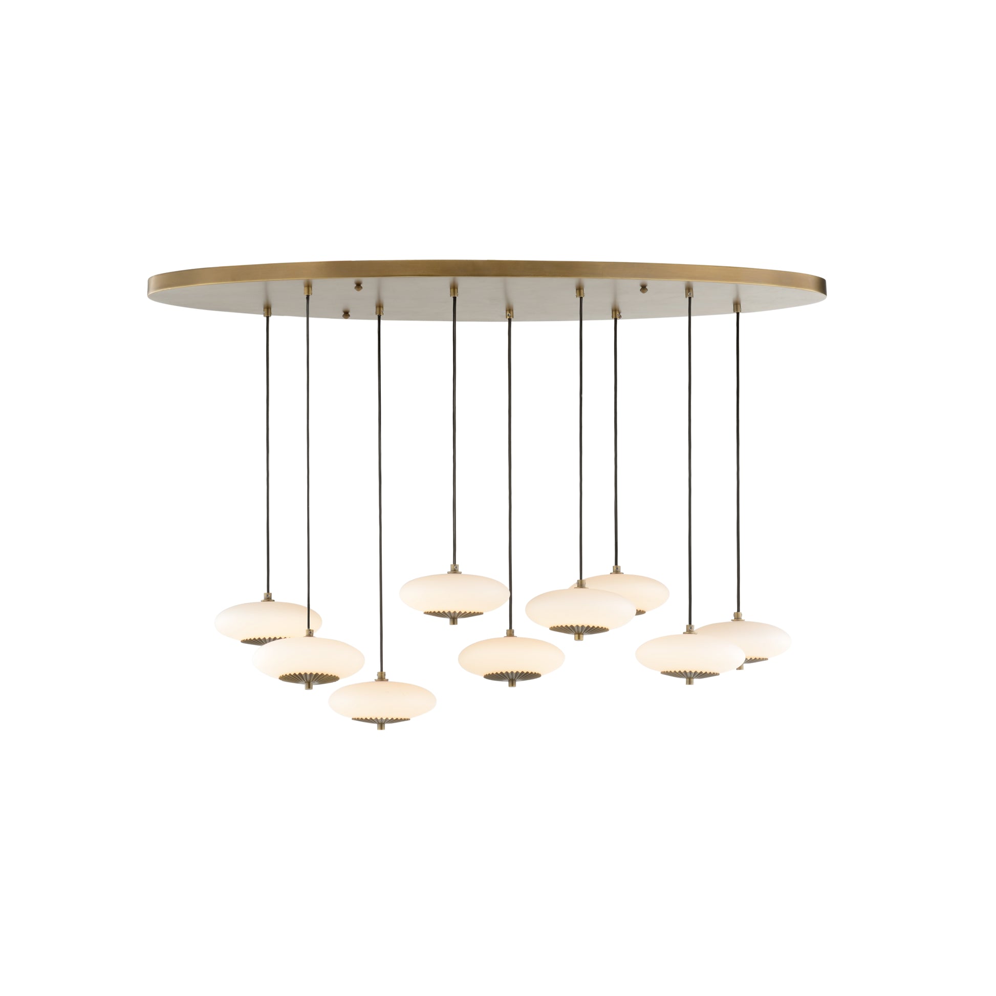 A thoughtful mix of feminine elegance partnered with a modern sensibility; the Collier Chandelier is a statement-making multi-drop fixture. Pleated brass accents highlight milk glass spheres suspended from adjustable height cords offer flexibility across a myriad of applications.