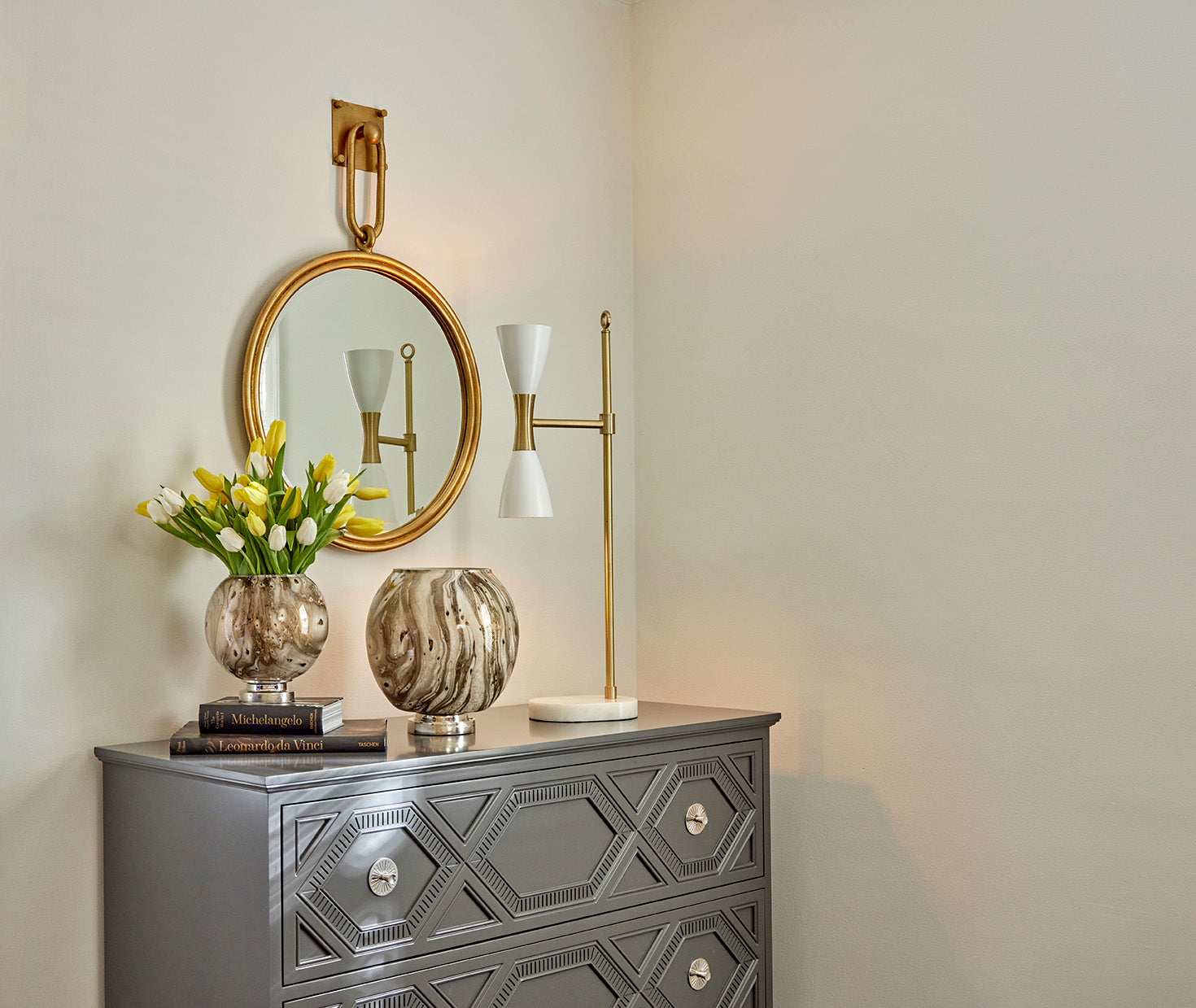 Open up your space while adding style with Grenada Mirror. This versatile mirror features an antique gold leaf finish on a classic circular shaped iron frame. The modern design is suspended from a square wall hook for added dimension. Hang this large, beveled mirror over a sofa, credenza or cabinet in your living area to reflect your design aesthetic. (Available in other sizes and finishes)