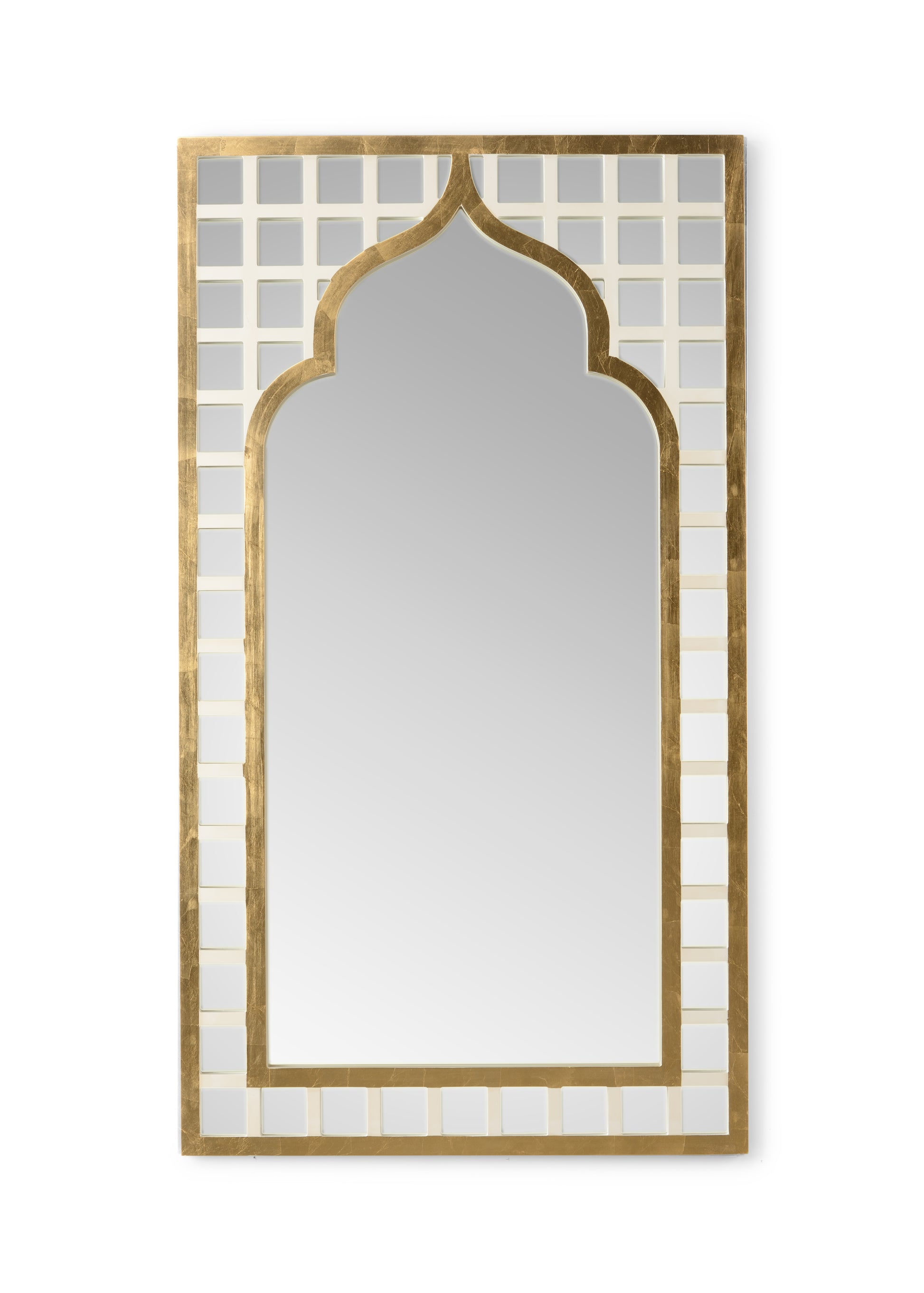 Beautiful Treillage Mirror in cream and antique gold leaf with a clear beveled mirror. Designed by Claire Bell.